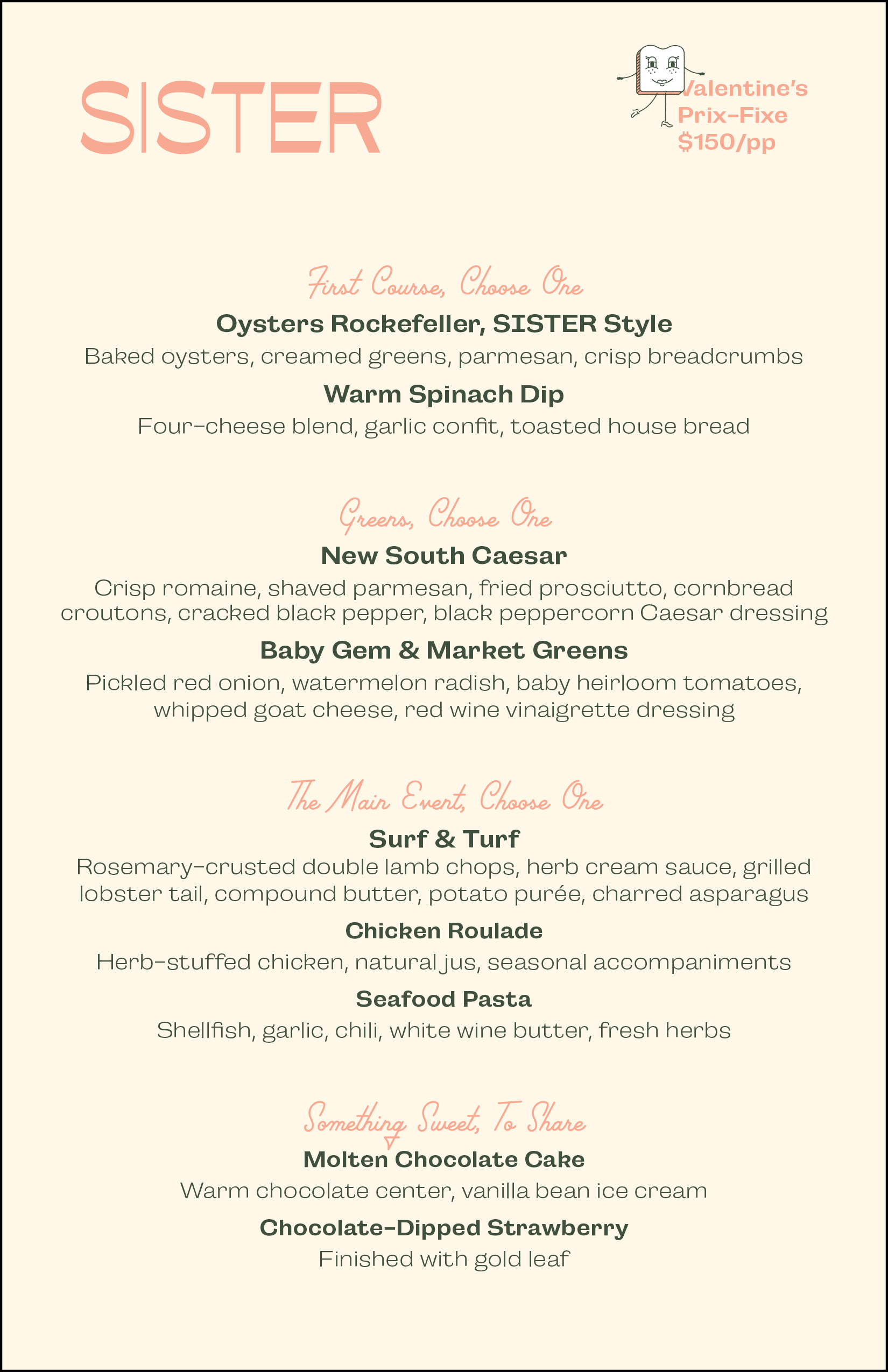 Join us at SISTER on Valentine's Day for a special prix-fixe menu and an evening made for dressing up, lingering longer, and letting romance show out.
